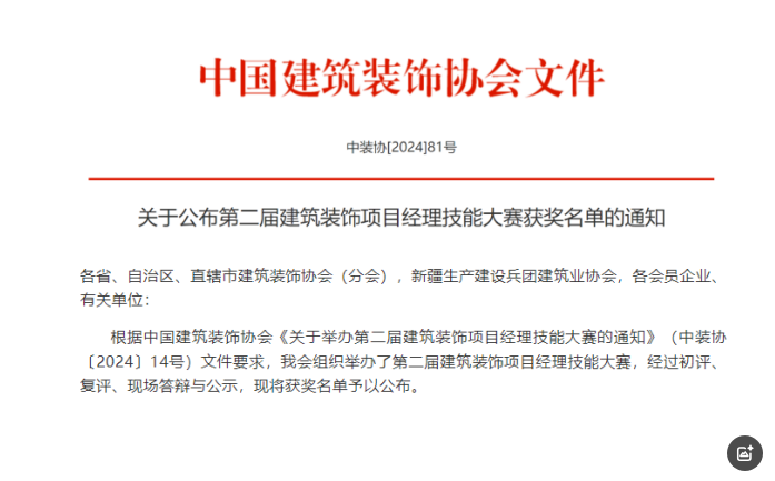 推進建筑裝飾行業(yè)工業(yè)化、數字化、綠色化、裝配化轉型升級,中國建筑裝飾協會舉辦了(第二屆)建筑裝飾項目經理技能大賽。 -