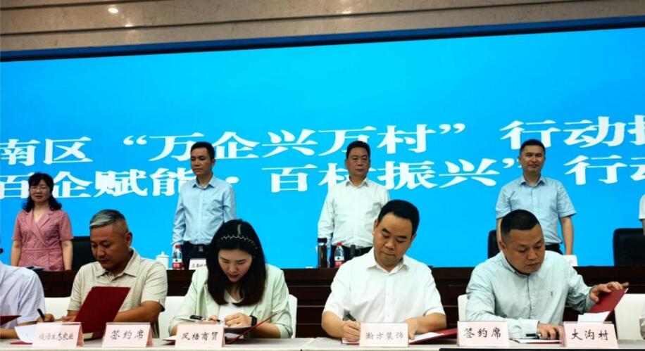 2023年6月2日上午,巴南區(qū)召開了萬企興萬村行動推進會暨百企賦能、百村振興行動工作會,巴南區(qū)委常委、統戰(zhàn)部部長徐江海出席會議并講話。重慶瀚方裝飾工程有限公司積極響應號召,與圣燈山鎮大溝村進行結對共建,公司總經理譚小平先生與大溝村支部書記文鋼同志現場簽訂共建協議。作為巴南區(qū)建筑業(yè)商會副會長的譚小平先生,代表商會舉牌認養(yǎng)兔、豬、雞鴨等畜牧以及認領稻田、蔬菜等農作物,用實際行動支持萬企興萬村的推進。中